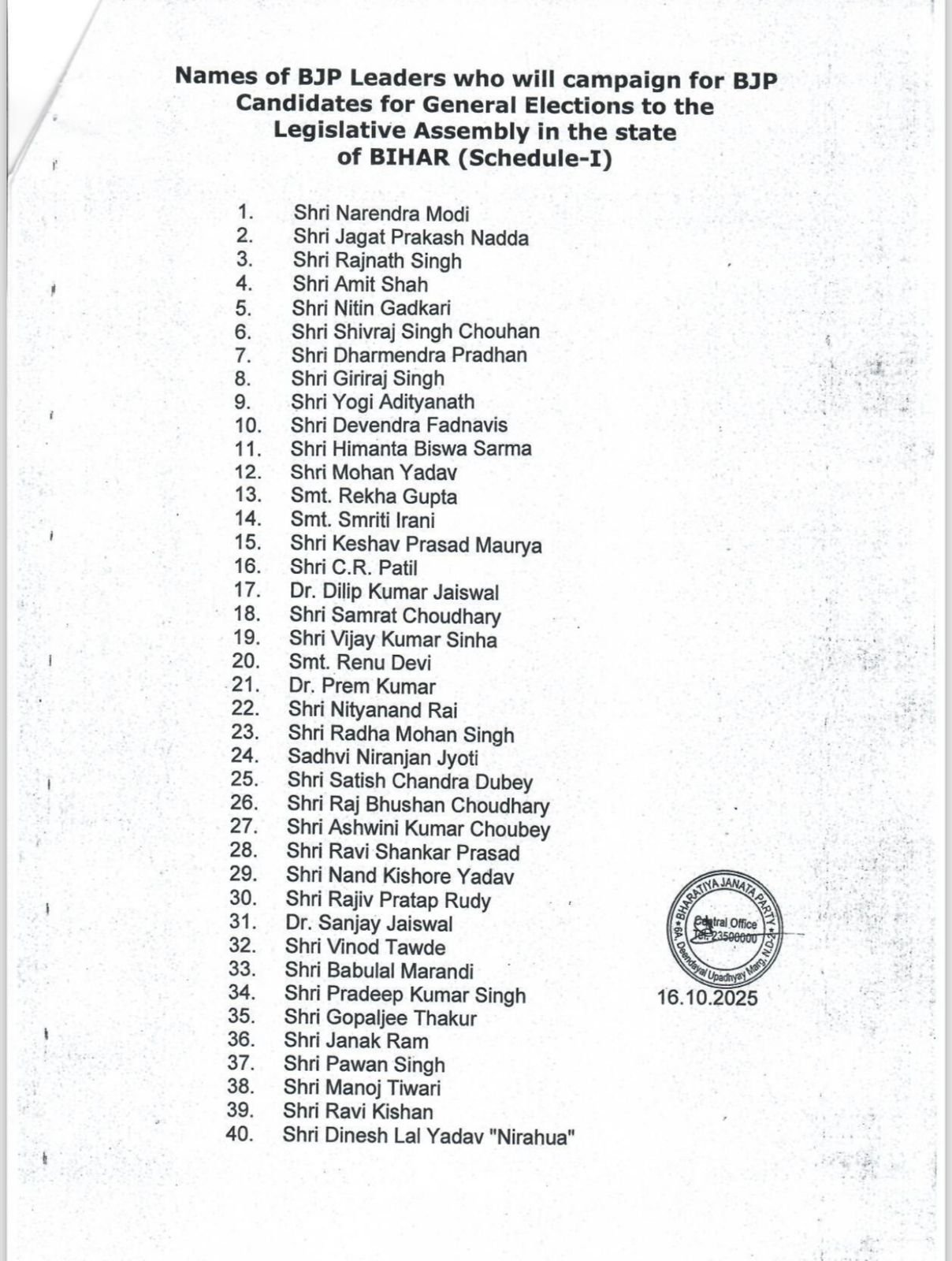 बिहार चुनाव 2025: बीजेपी ने स्टार प्रचारकों की लिस्ट जारी